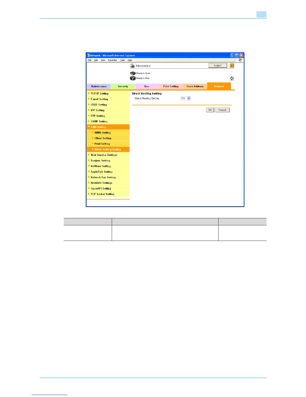 In Administrator mode of Web Connection, select the Network tab - "SMB Setting" - "Direct Hosting Setting".