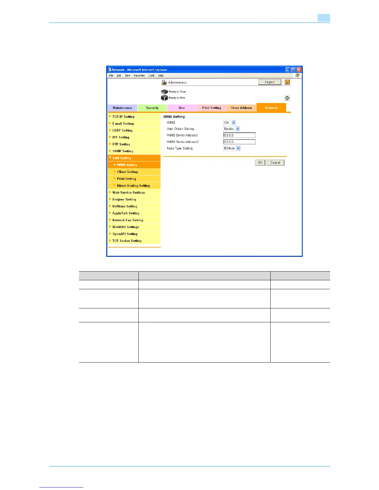 In Administrator mode of Web Connection, select the Network tab - "SMB Setting" - "WINS Setting".