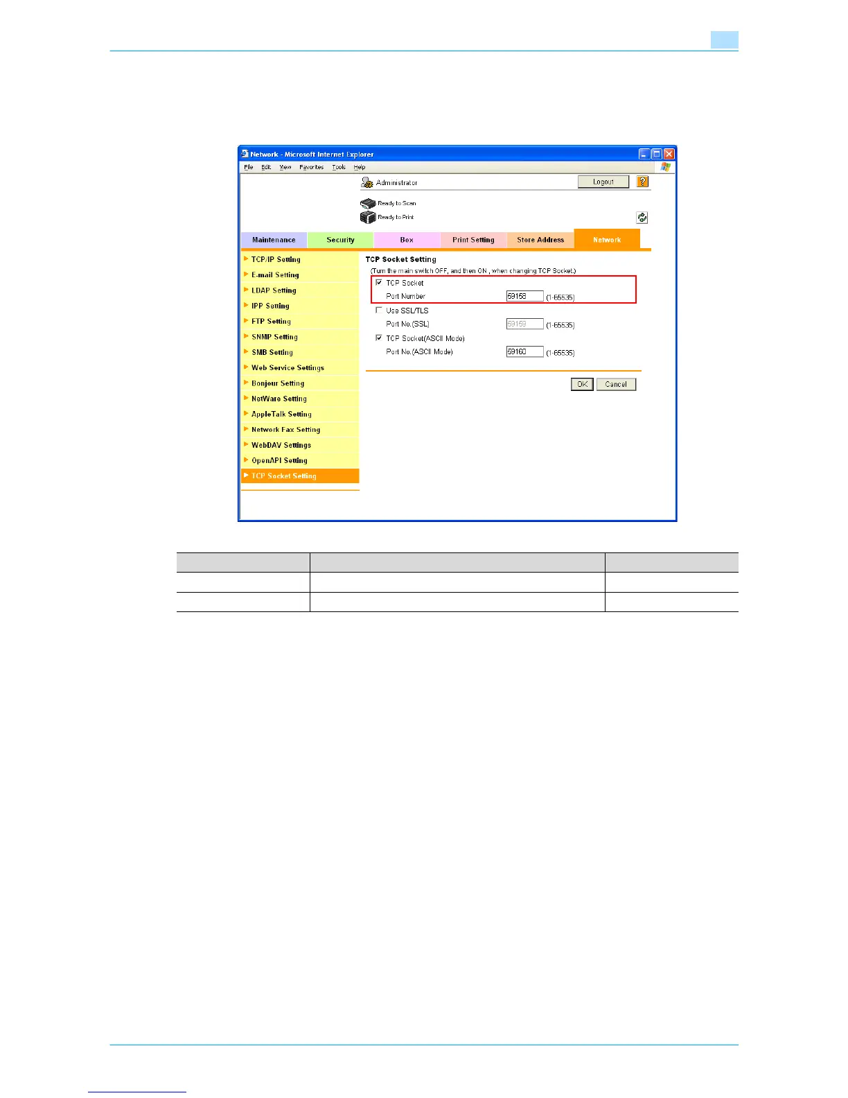 In Administrator mode of Web Connection, select the Network tab - "TCP Socket Setting".