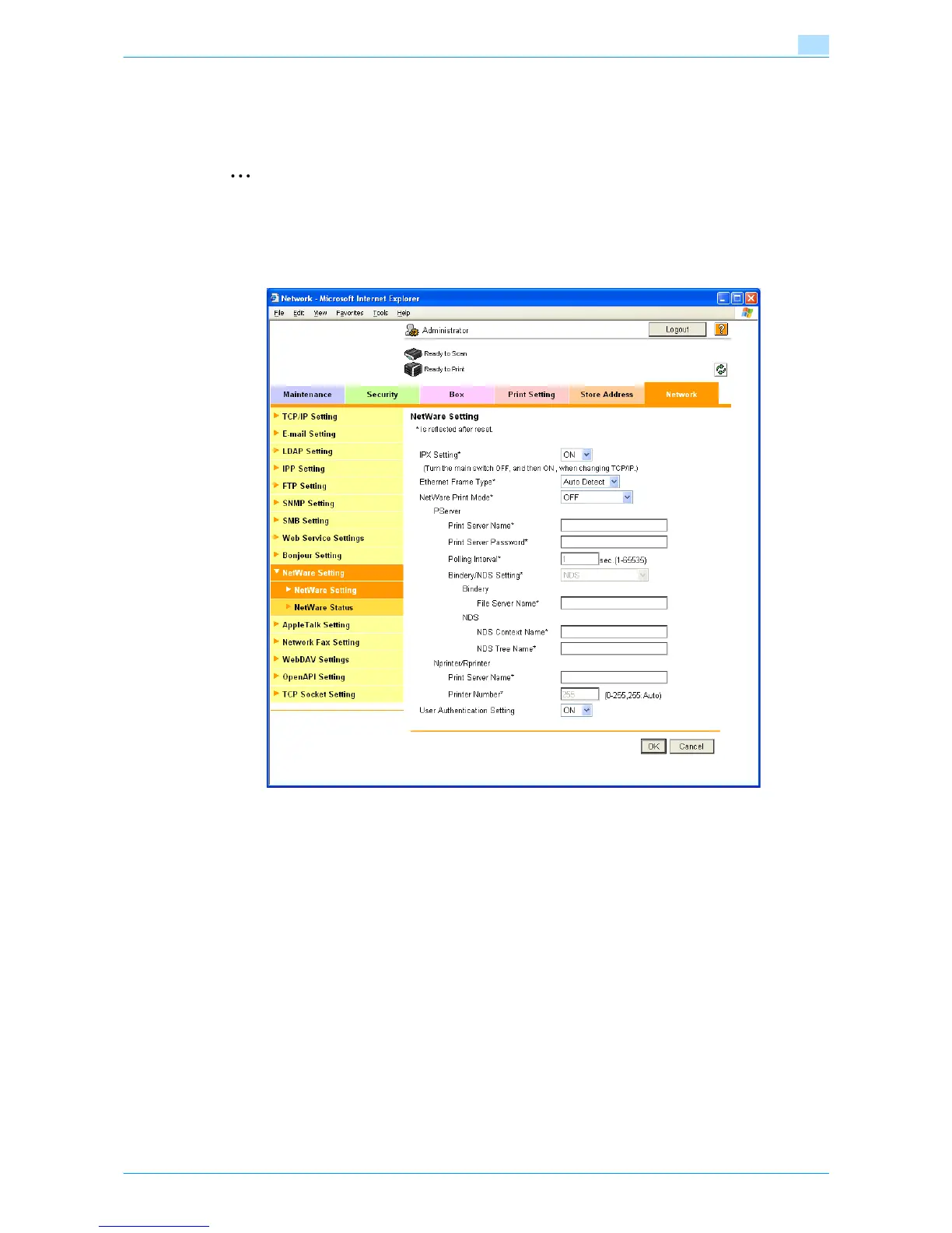 In Administrator mode of Web Connection, select the Network tab - "NetWare Setting" - "NetWare Setting".