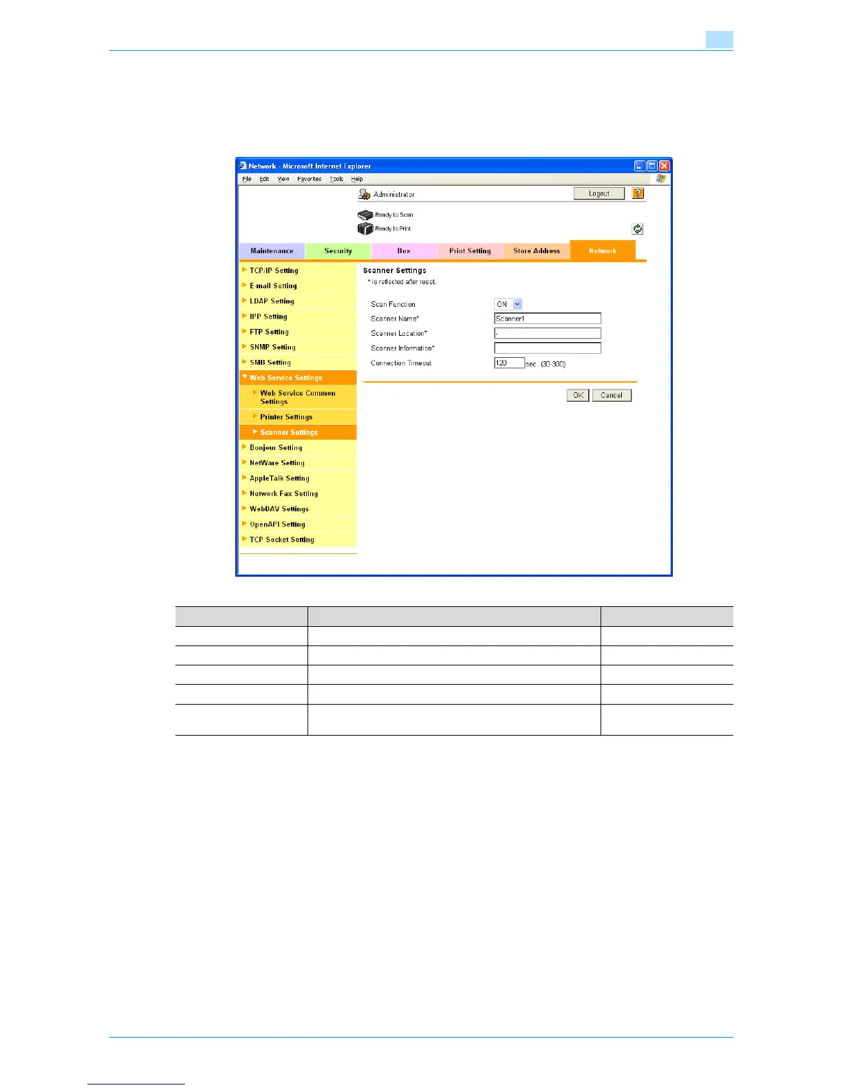 In Administrator mode of Web Connection, select the Network tab - "Web Service Settings" - "Scanner