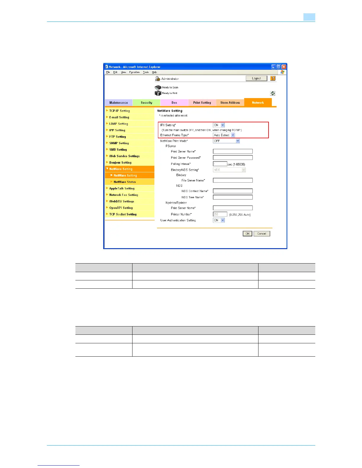 In Administrator mode of Web Connection, select the Network tab - "NetWare Setting" - "NetWare Setting".