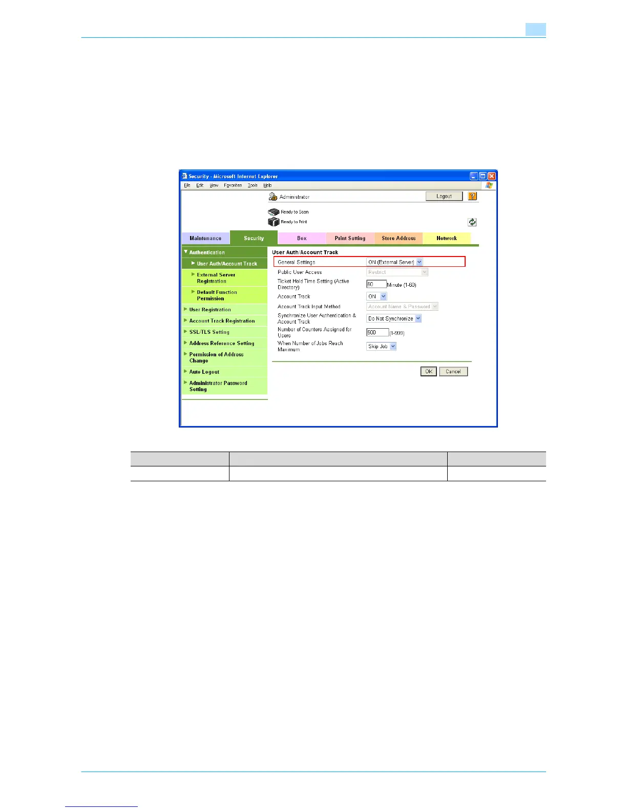 In Administrator mode of Web Connection, select the Security tab - "Authentication" - "User Auth/Account