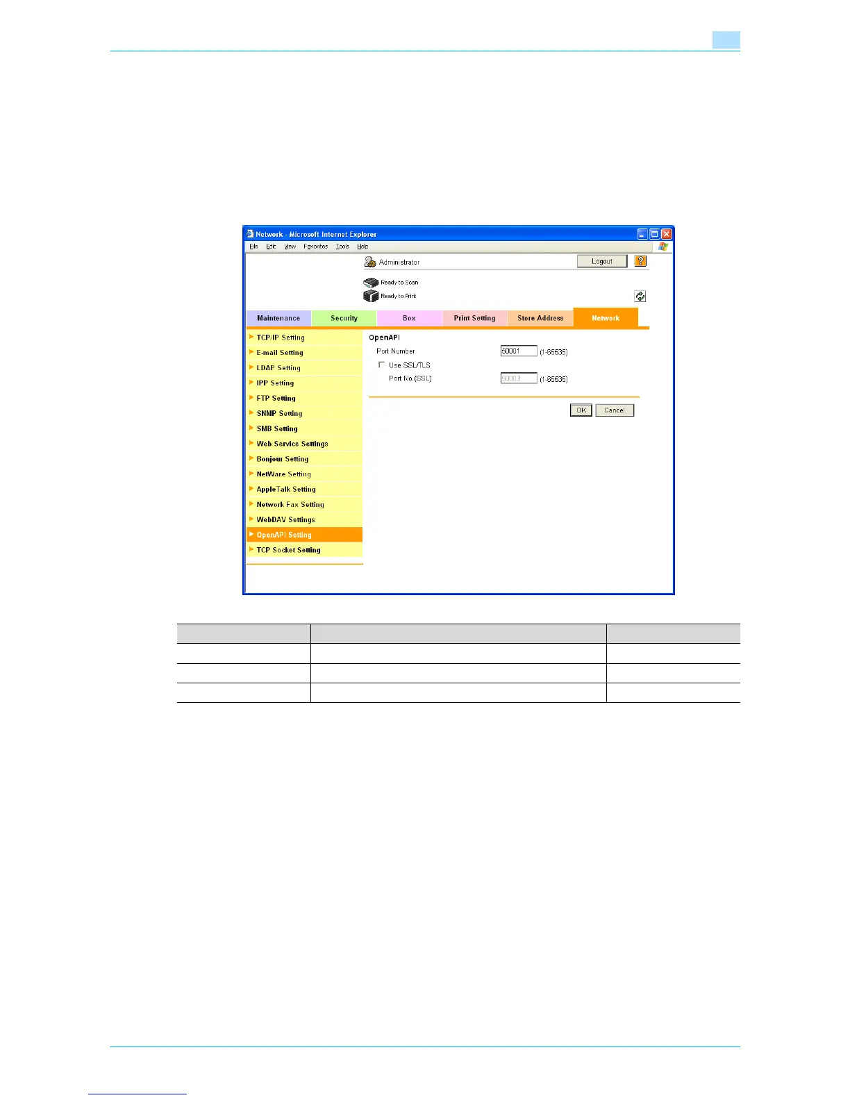 In Administrator mode of Web Connection, select the Network tab - "OpenAPI Setting".
