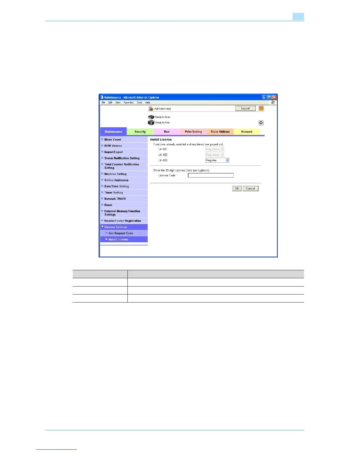 In Administrator mode of Web Connection, select the Maintenance tab - "License Settings" - "Install