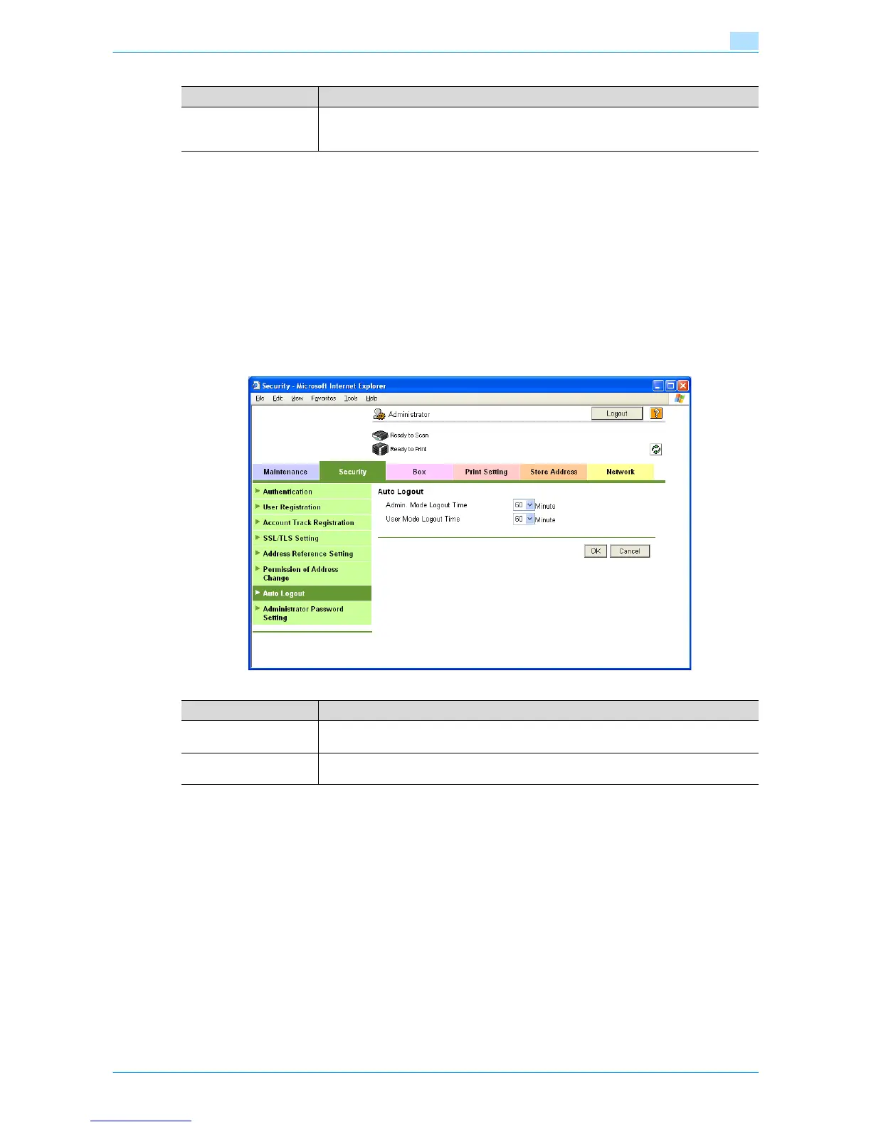 User Mode Logout Time Specify the time period before the user is automatically logged out when no operation is