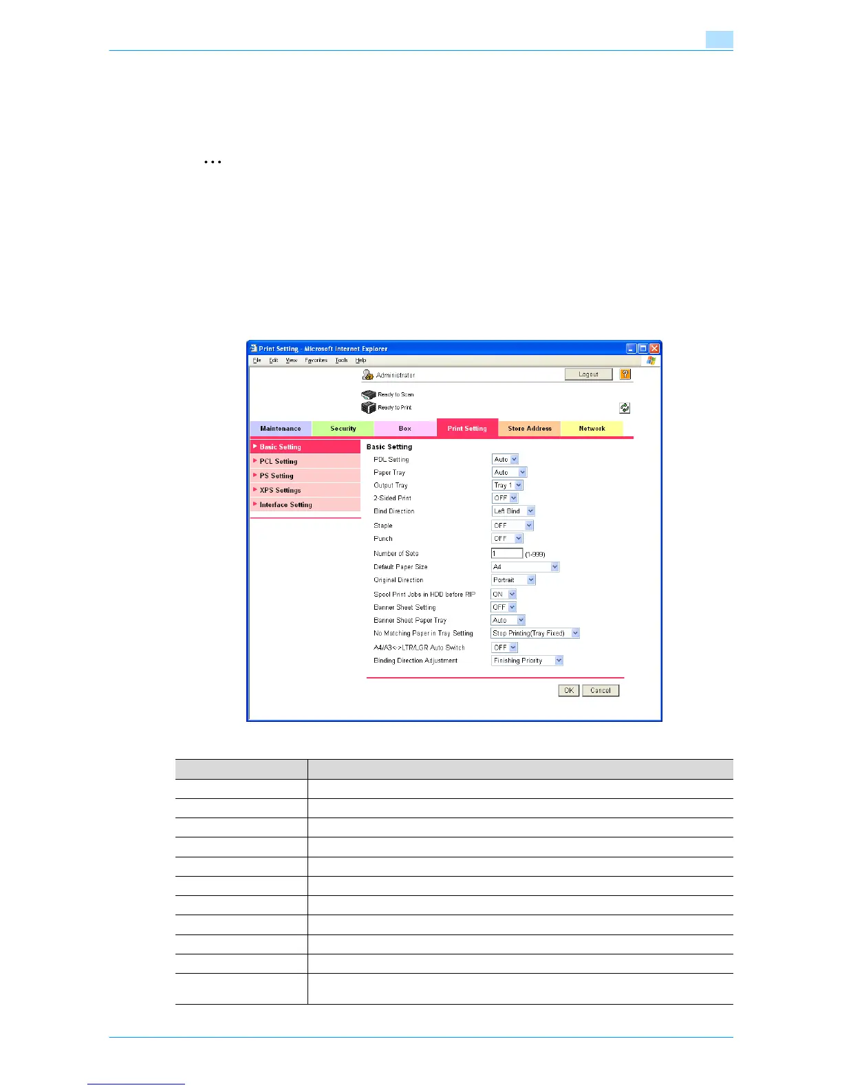 In Administrator mode of Web Connection, select the Print Setting tab - "Basic Setting".