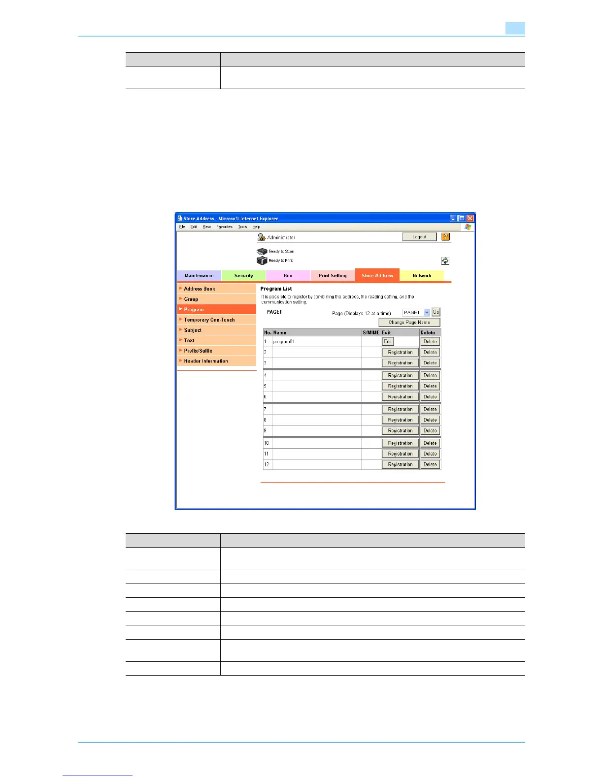 In Administrator mode of Web Connection, select the Store Address tab - "Program".