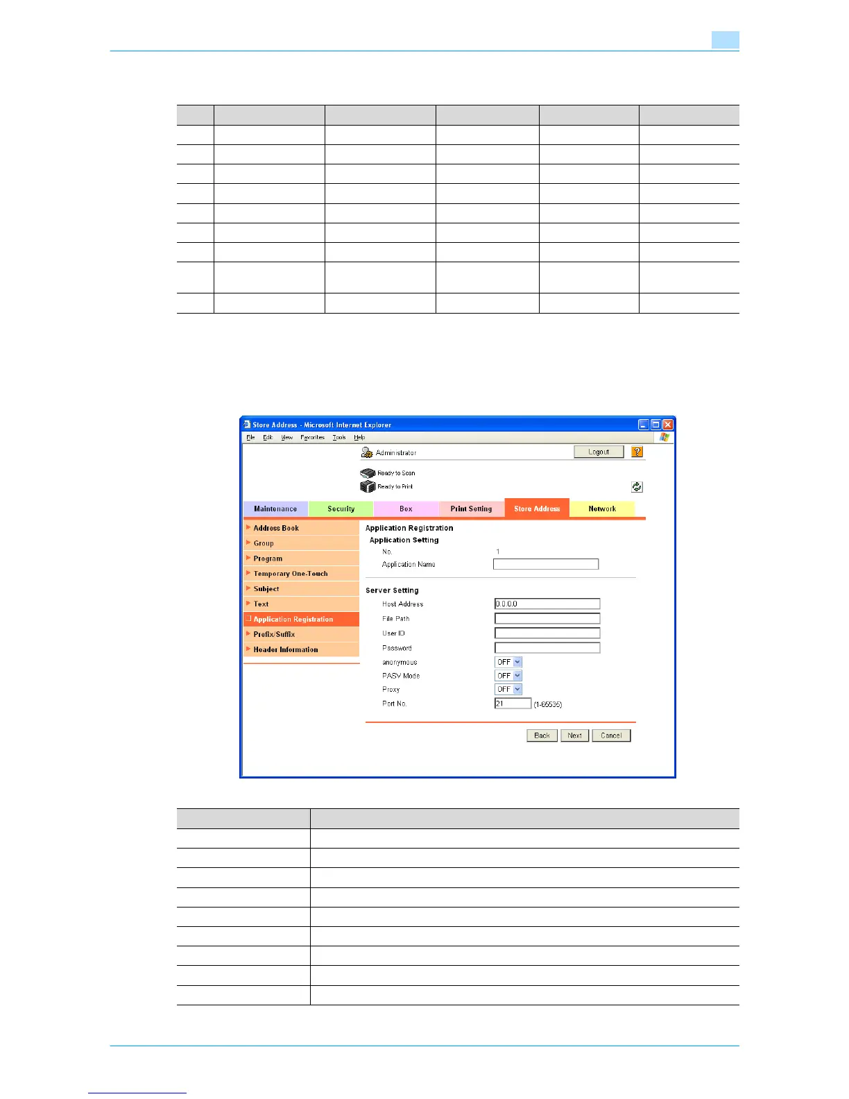 In Administrator mode of Web Connection, select the Store Address tab - "Application Registration" -