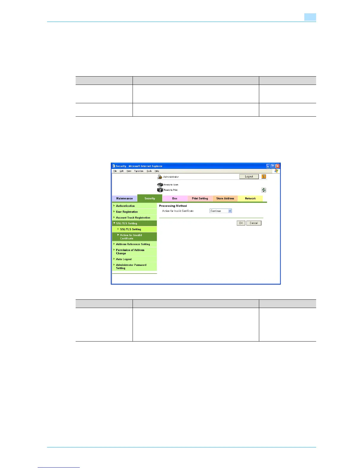In Administrator mode of Web Connection, select the Security tab - "SSL/TLS Setting" - "Action for Invalid