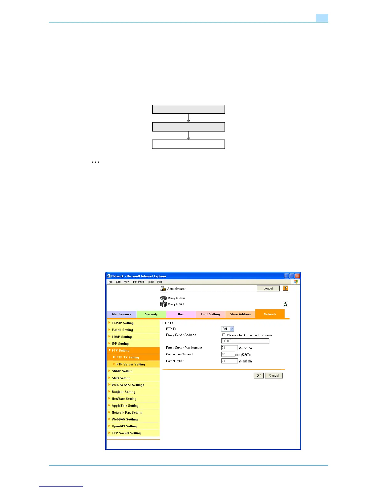 For details on the FTP-based file transmission, refer to the User’s Guide [Network Scan/Fax/Network