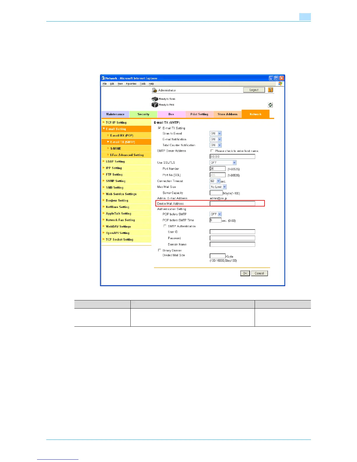 In Administrator mode of Web Connection, select the Network tab - "E-mail Setting" - "E-mail TX (SMTP)".