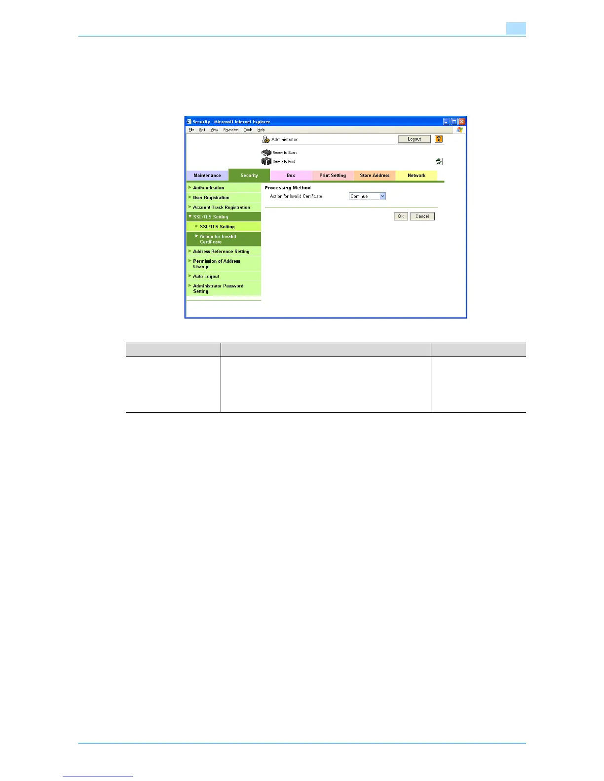 In Administrator mode of Web Connection, select the Security tab - "SSL/TLS Setting" - "Action for Invalid