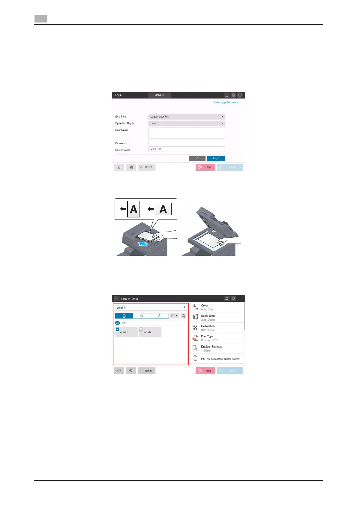 If user authentication is enabled, the login screen appears. Enter the required items, and tap [Login].