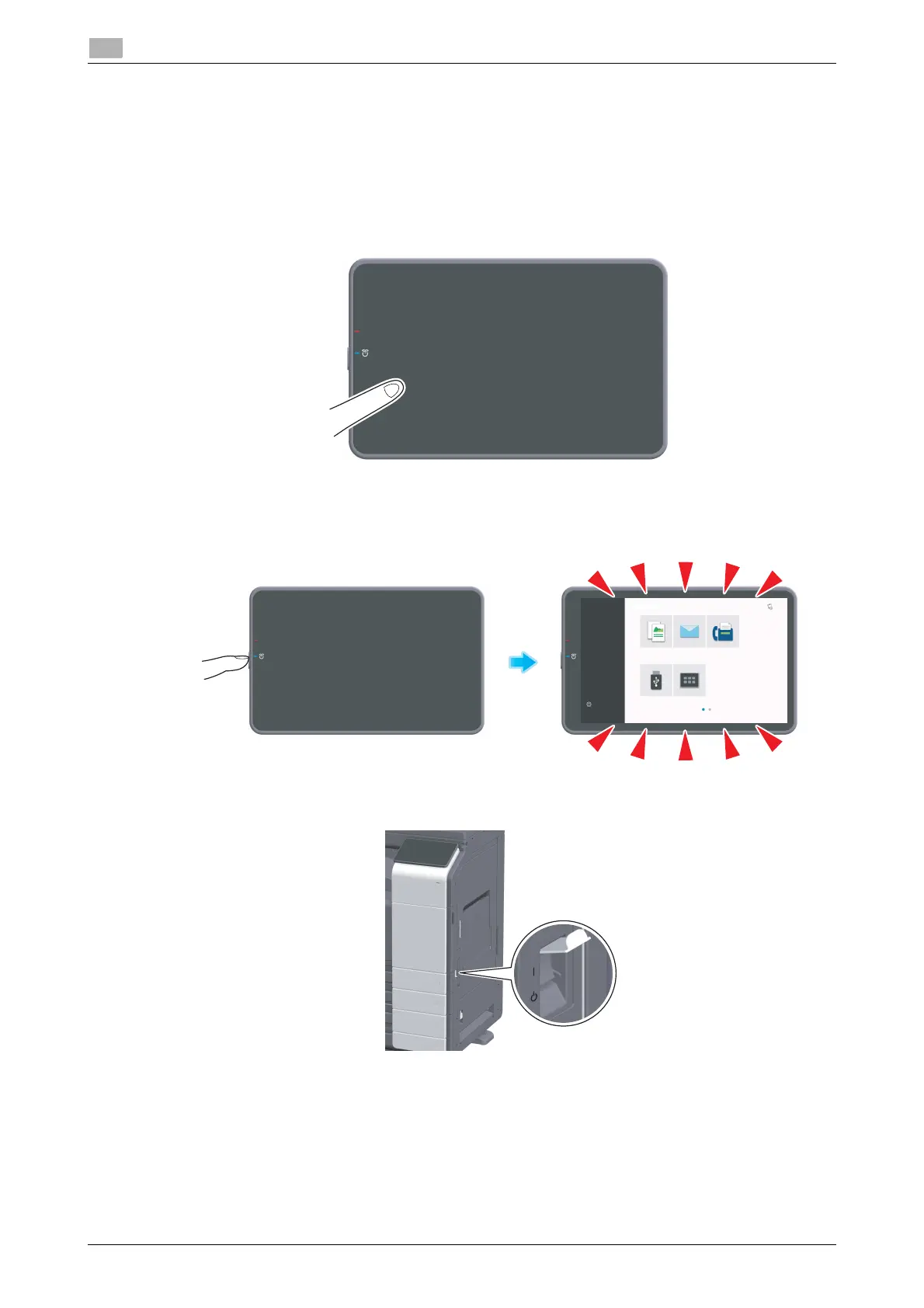 - Touch the Touch Panel. In Power Save (Low Power/Sleep) mode, this machine returns from Power