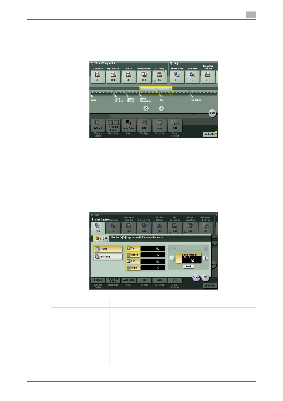 To display: [Scan/Fax] - [Application] - [App] - [Frame Erase]