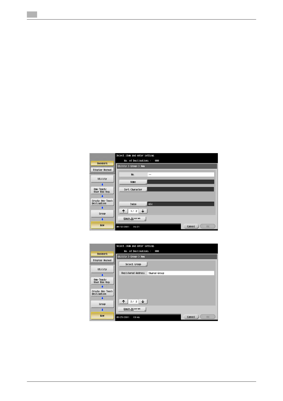 1 Tap [Utility] - [One-Touch/User Box Registration] - [Create One-Touch Destination] - [Group] - [New].