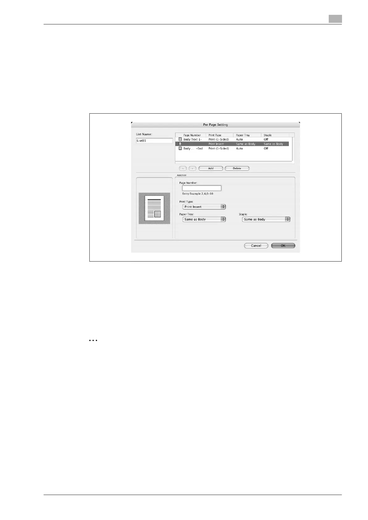 4 Select the row that was added to the list, and then specify the print settings in "Add/Edit".