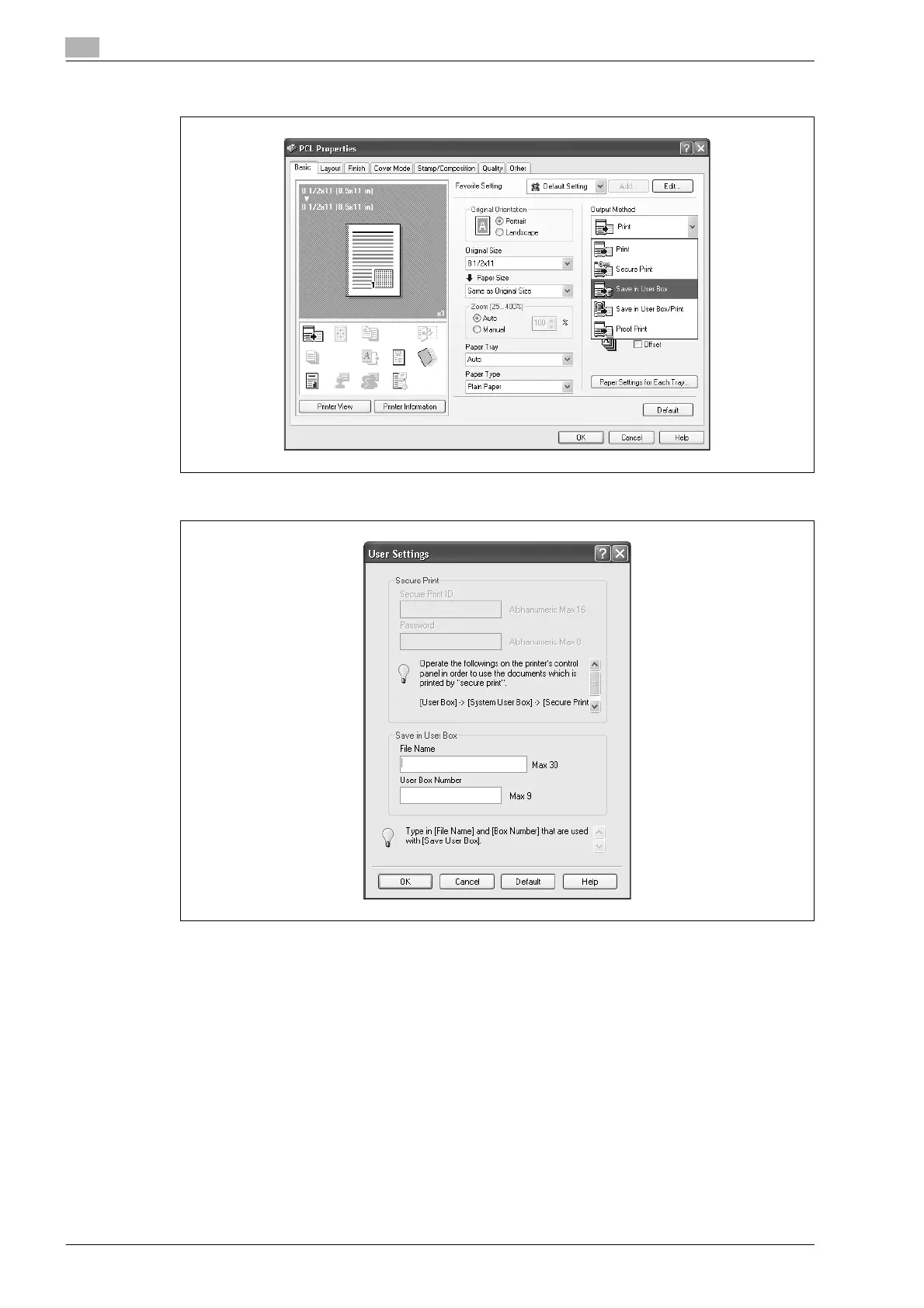 3 From the "Output Method" list, select "Save in User Box" or "Save in User Box/Print".