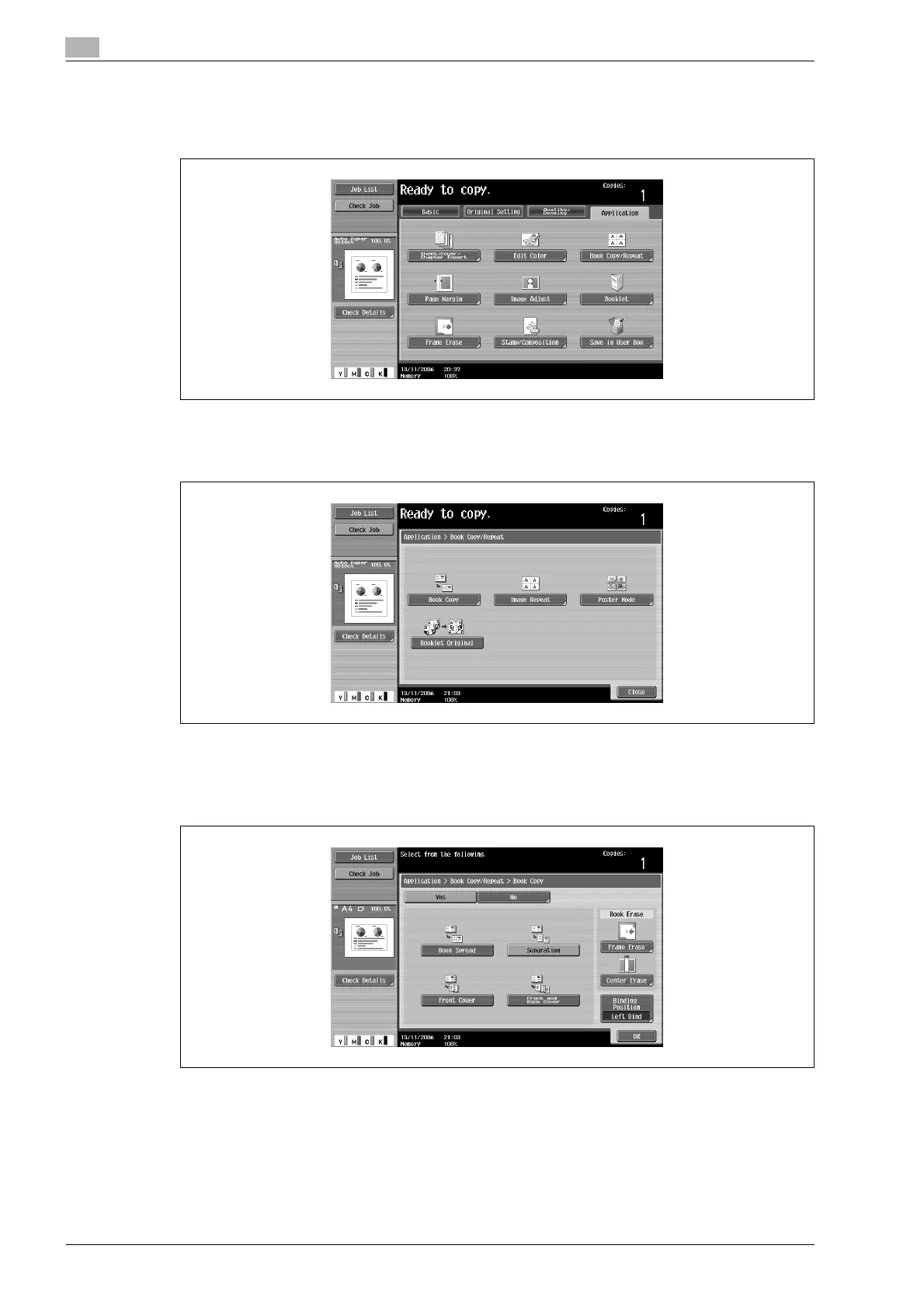 – If desired, specify a Book Erase function. Touch the button for the erasing method, touch [-] and [+]