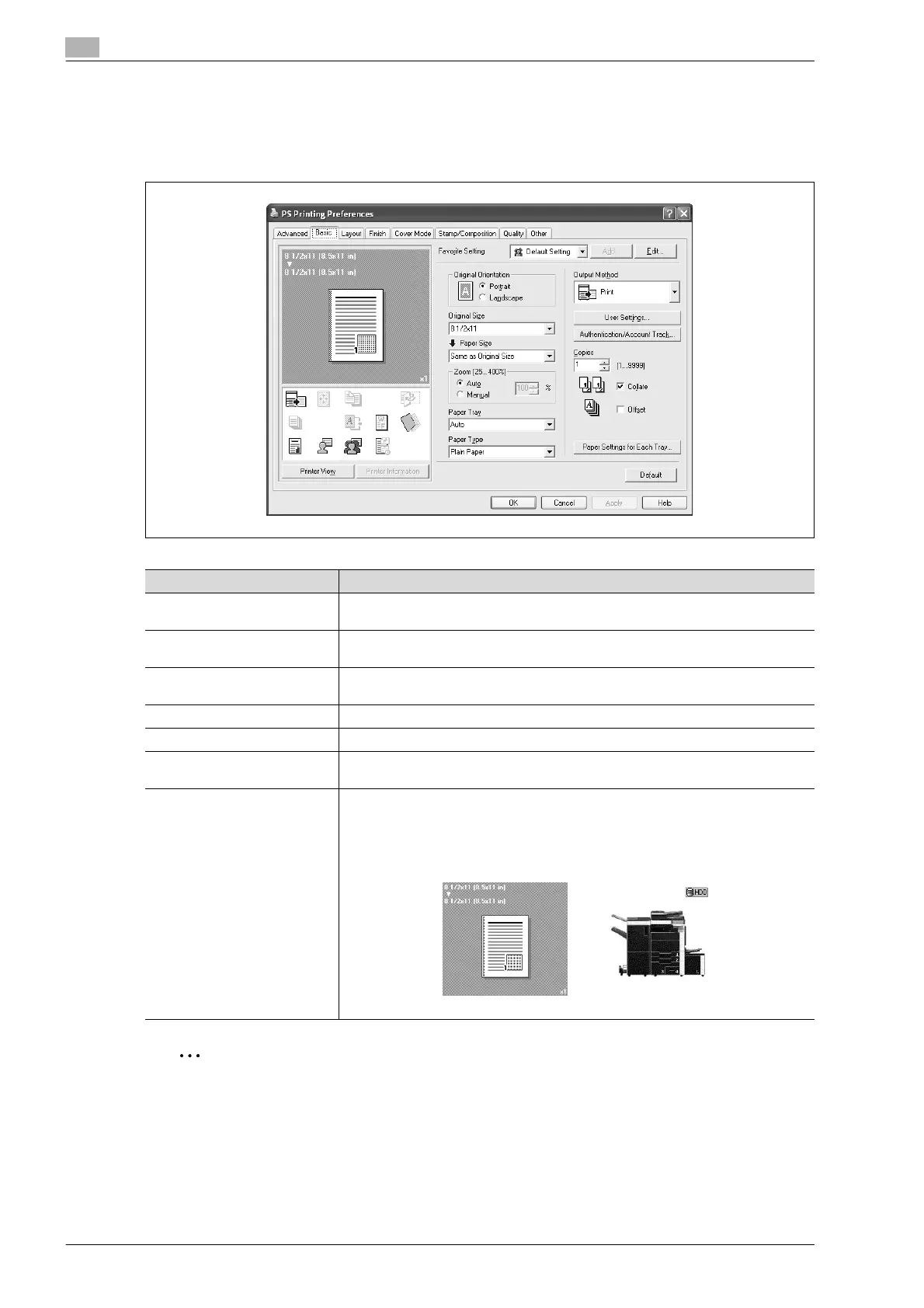 in the current settings is displayed and a preview image of the print job can be