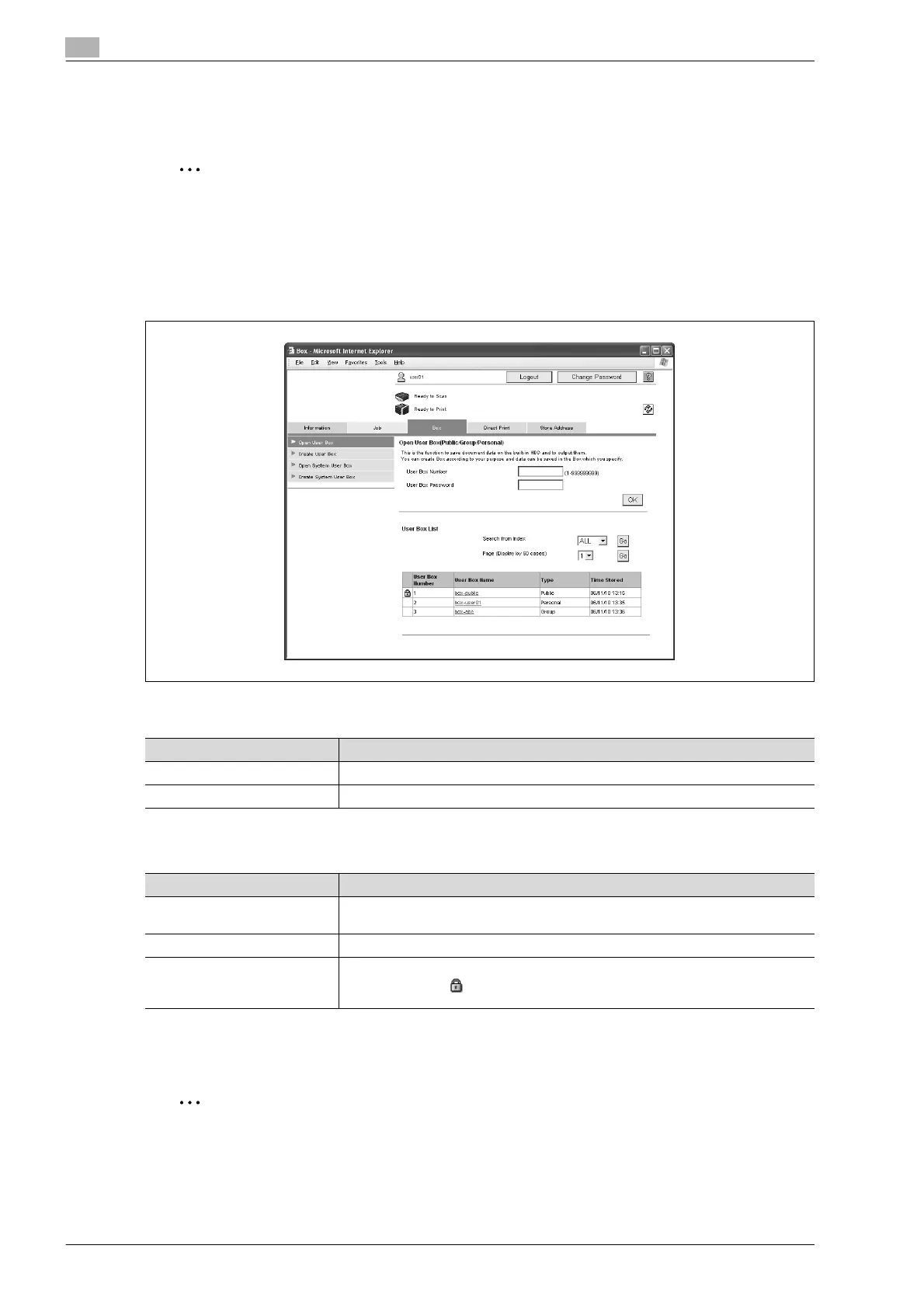 User Box List Displays the user box number, user box name, user box type and date/time that the