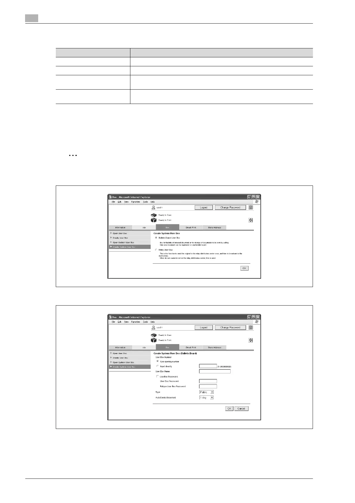 "Create System User Box" appears when the optional fax kit is installed. New bulletin board user boxes and