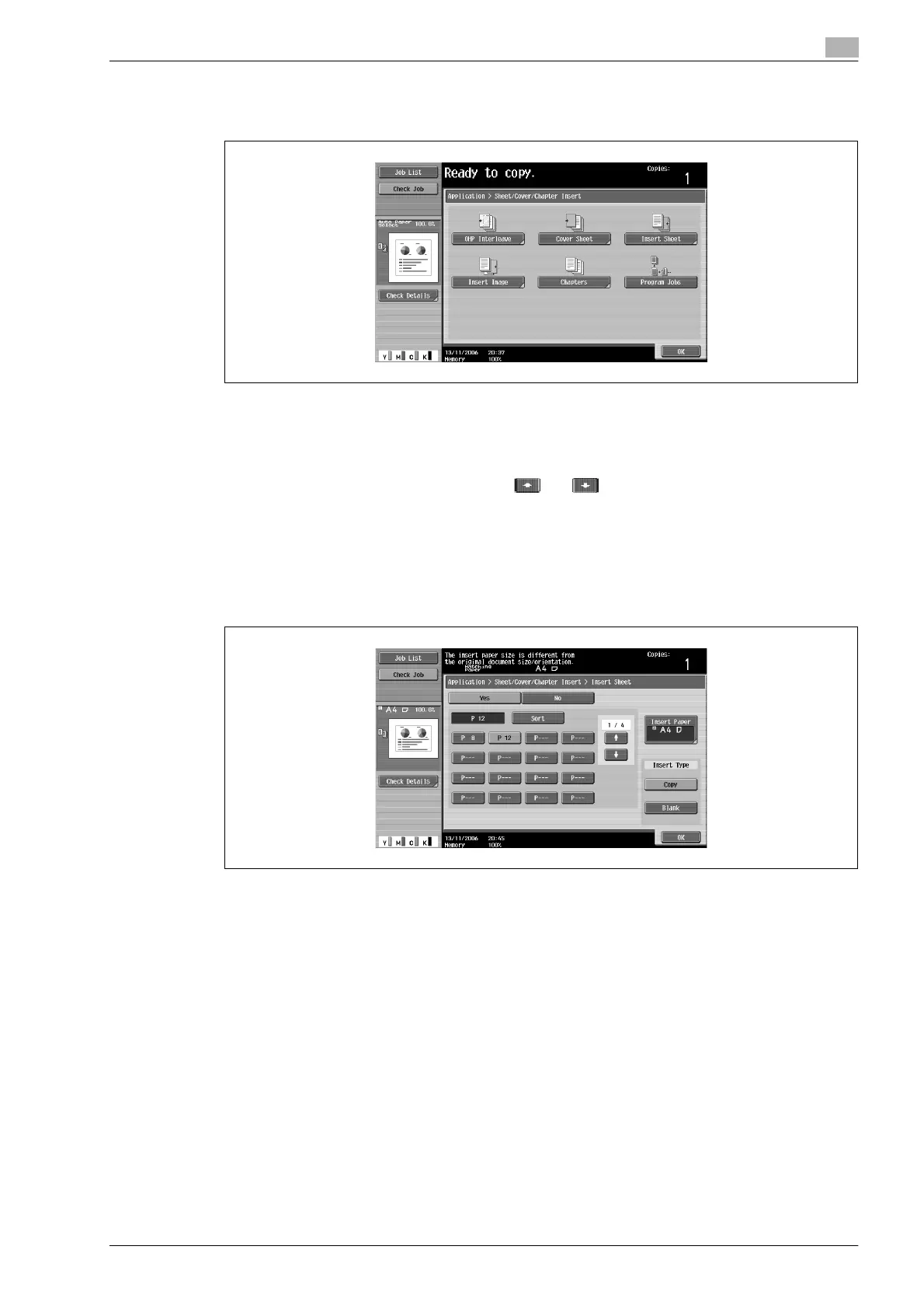 There are two Insert Sheet screens. Touch and to display a different screen.