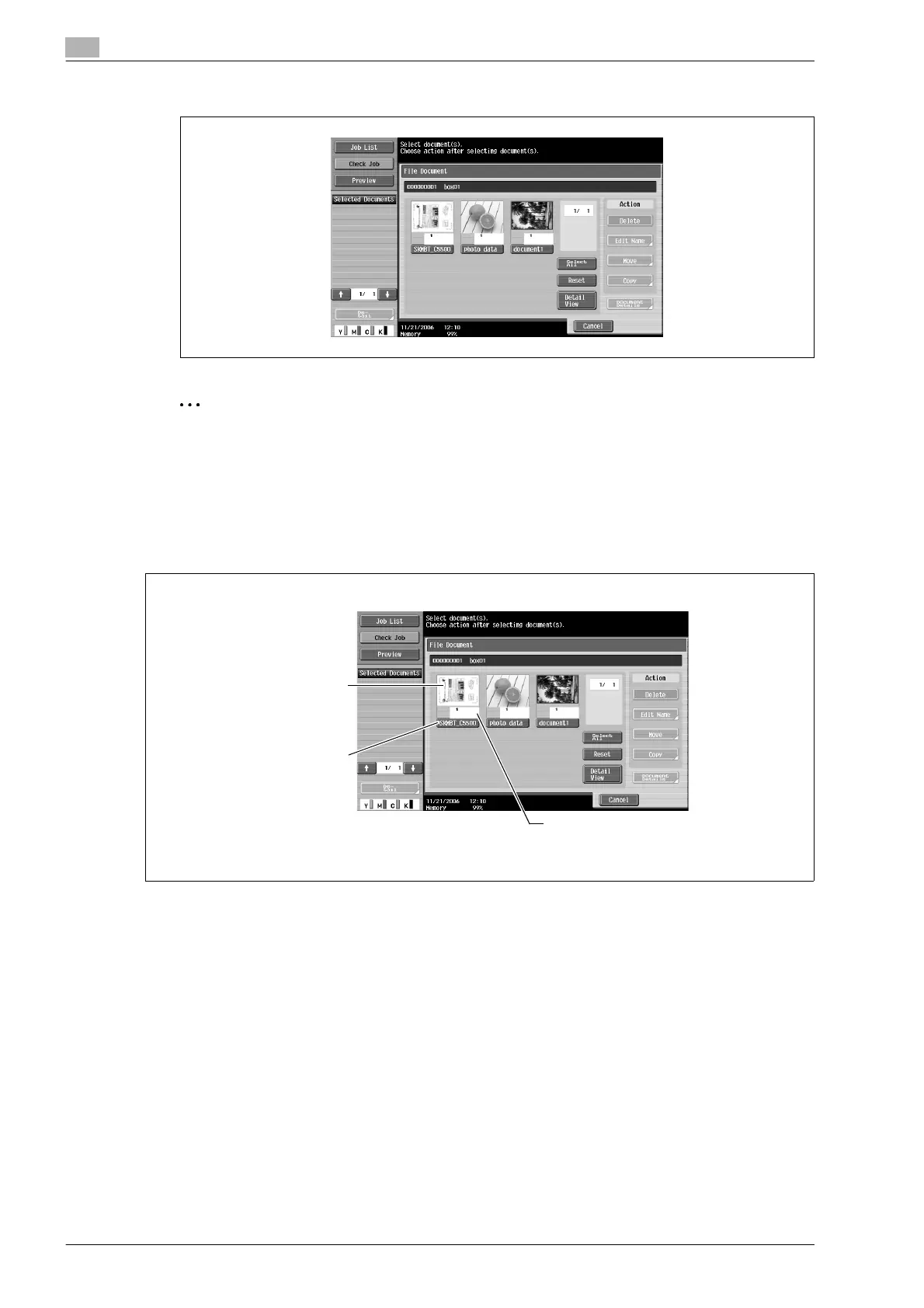 As a default, thumbnails of the saved documents and the document names are displayed. The following
