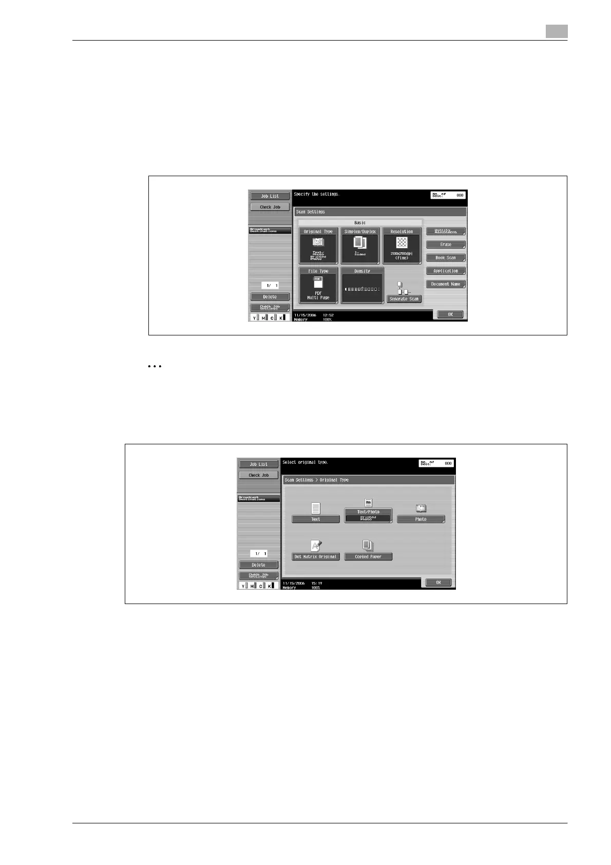 If [Scan Settings] is touched, [Original Type], [Simplex/Duplex], [Resolution], [File Type], [Density] are
