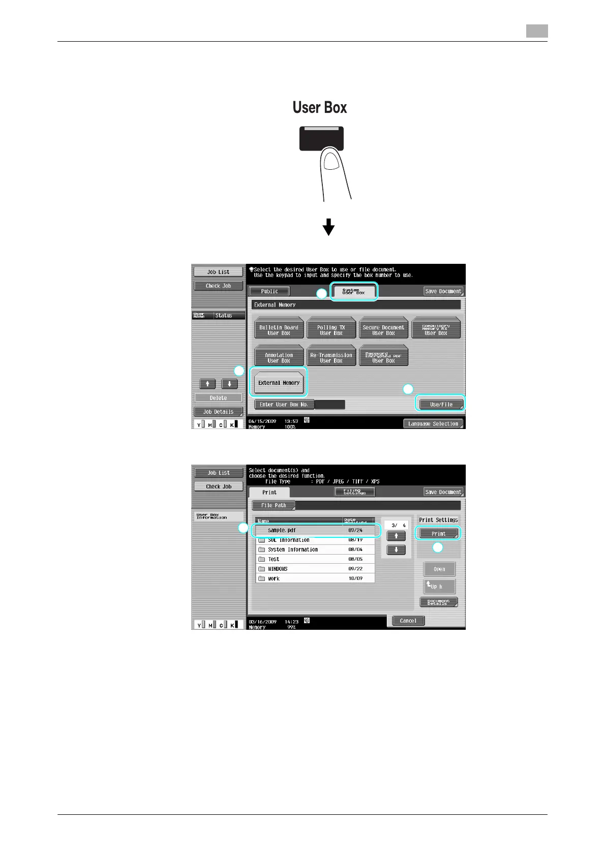 % If an external memory is already connected, press [Use/File] on the screen for User Box function.