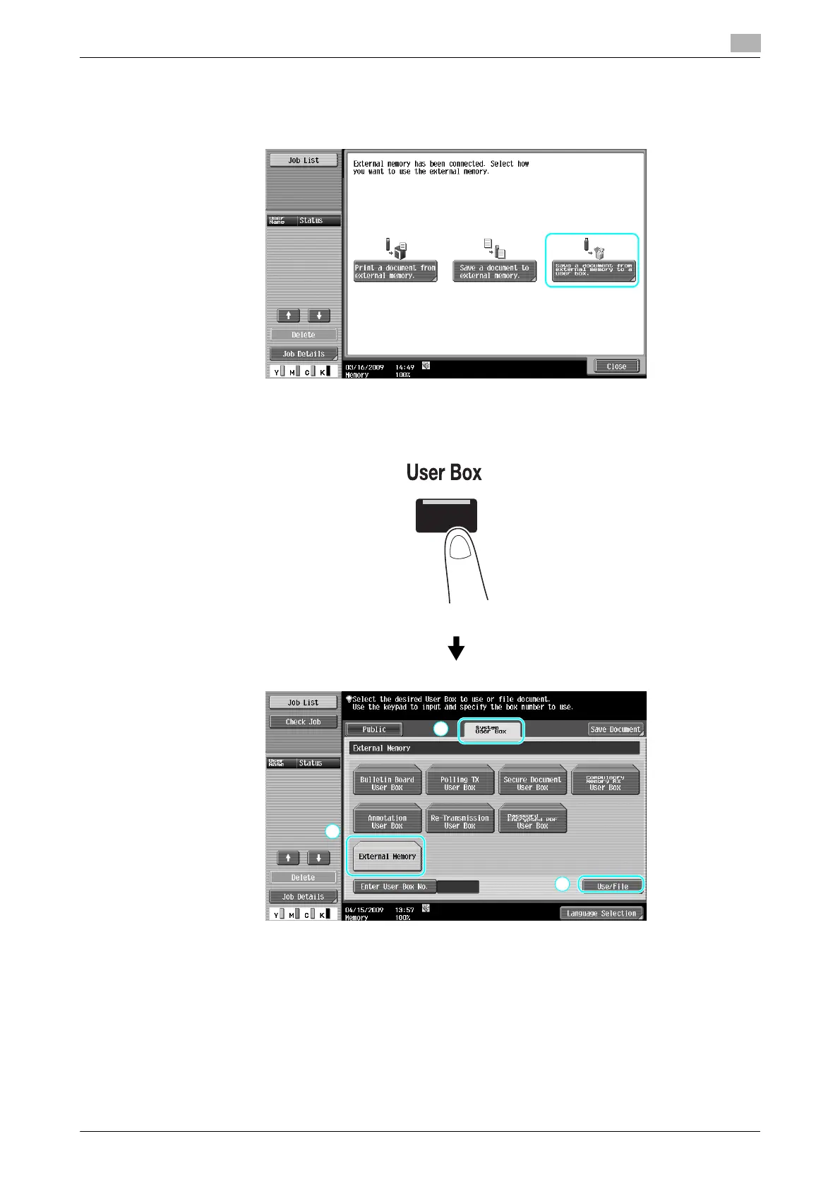 % If an external memory is already connected, press [Use/File] on the screen for User Box function.