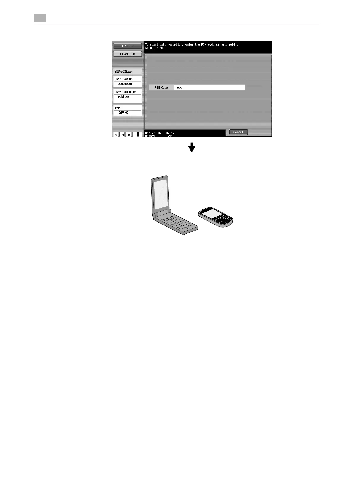 To receive a file from a cellular phone or PDA, select this machine, specify the file, and enter the PIN code in