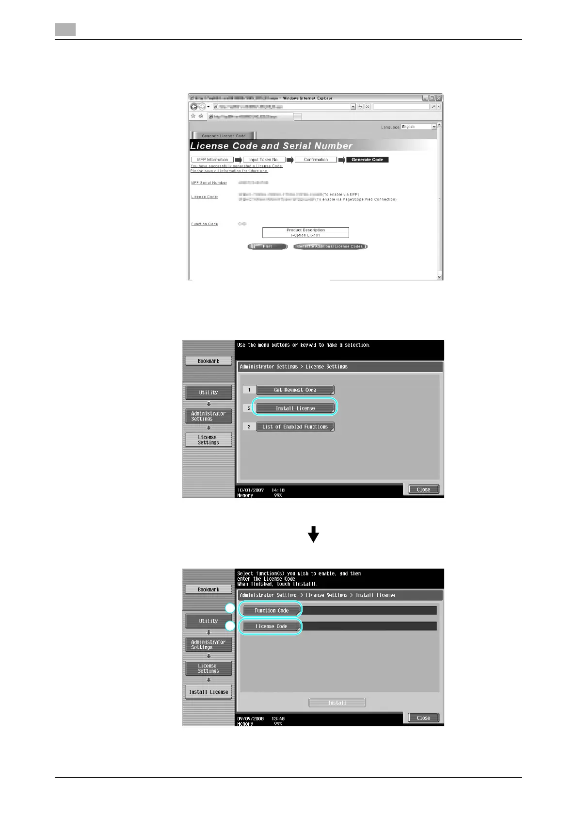 % On the License Settings screen of the Administrator Settings, press [Install License].