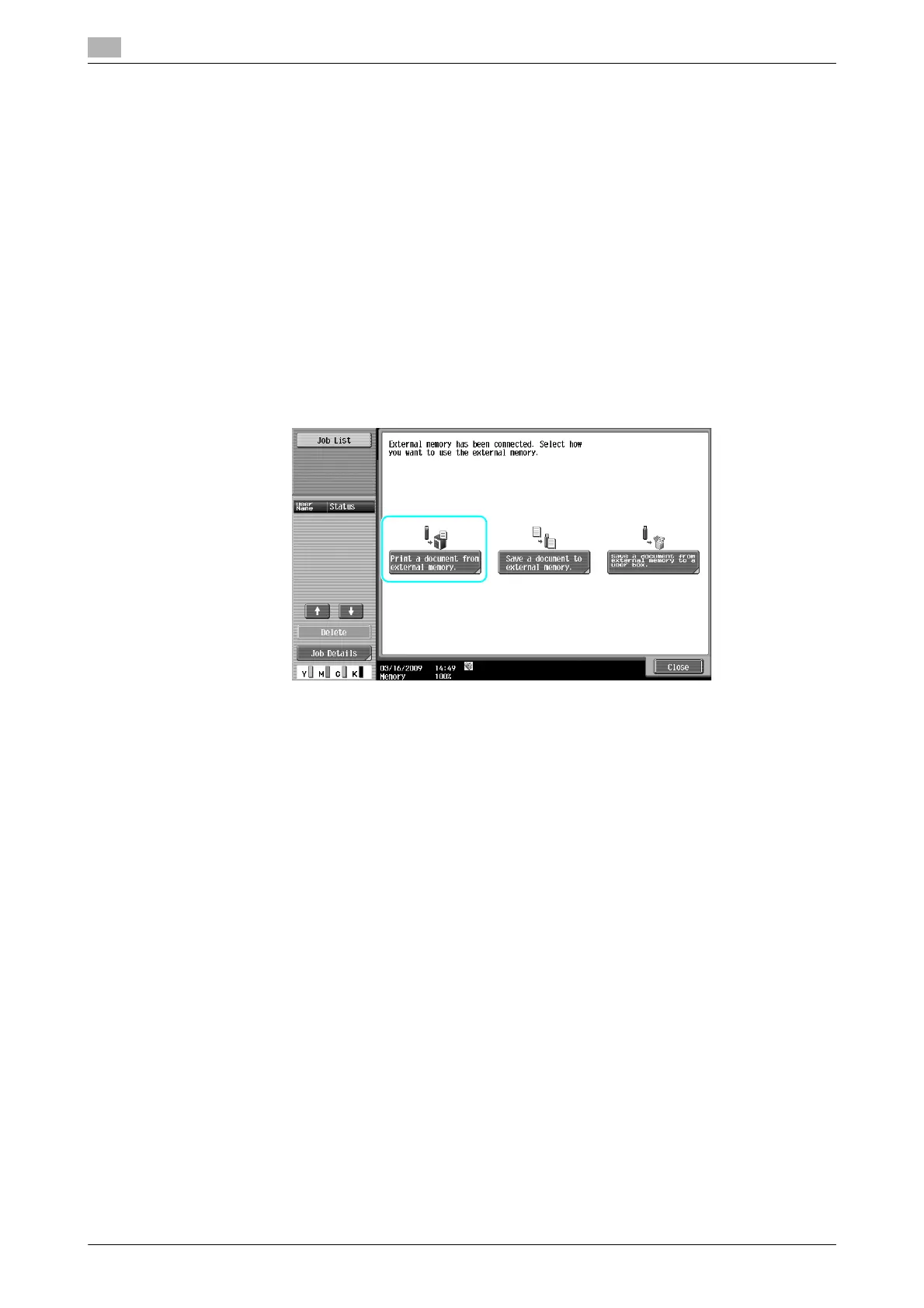 1 Connect the external memory to this machine, and press [Print a document from external memory.].