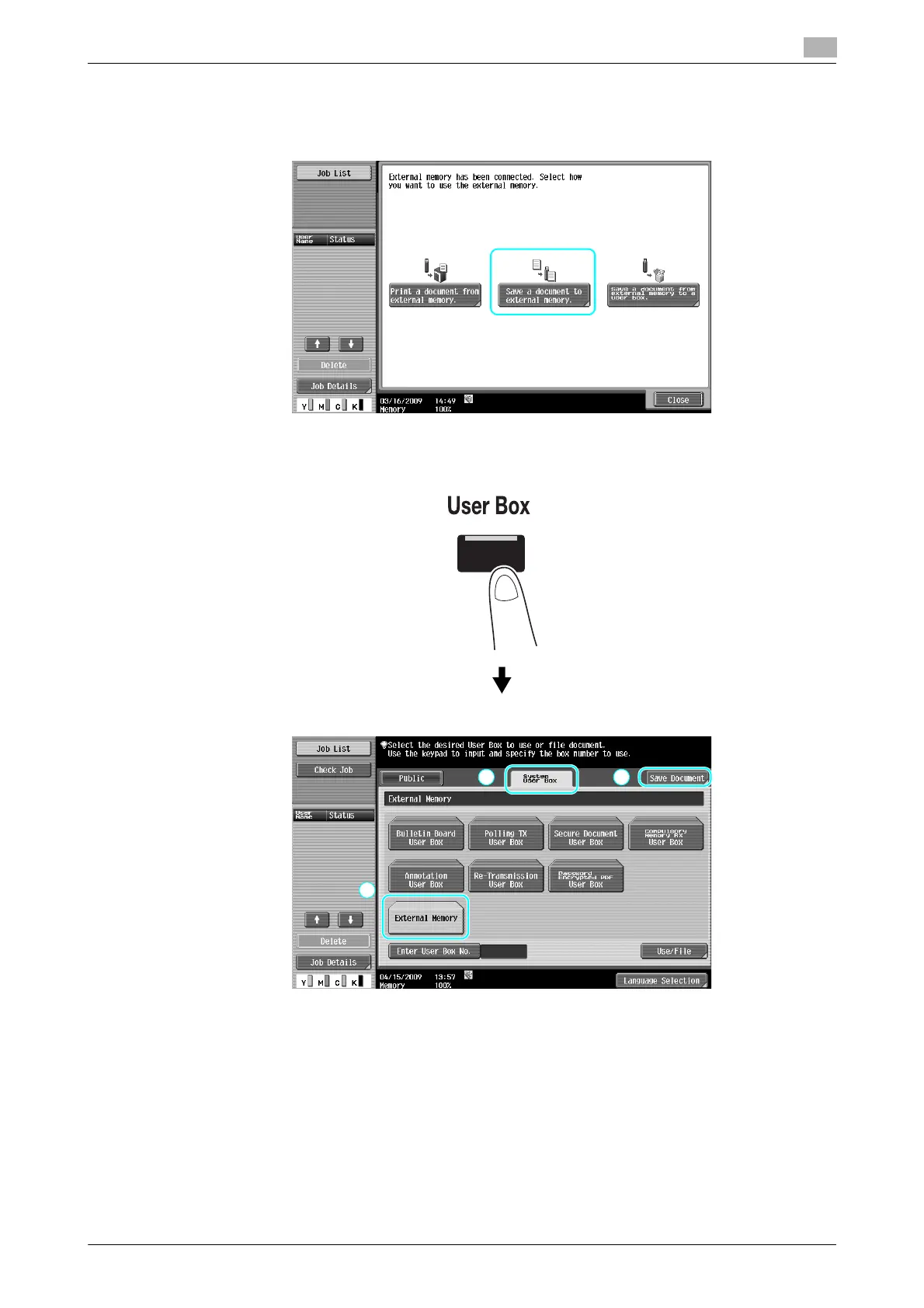 % If an external memory is already connected, press [Save Document] on the screen for User Box