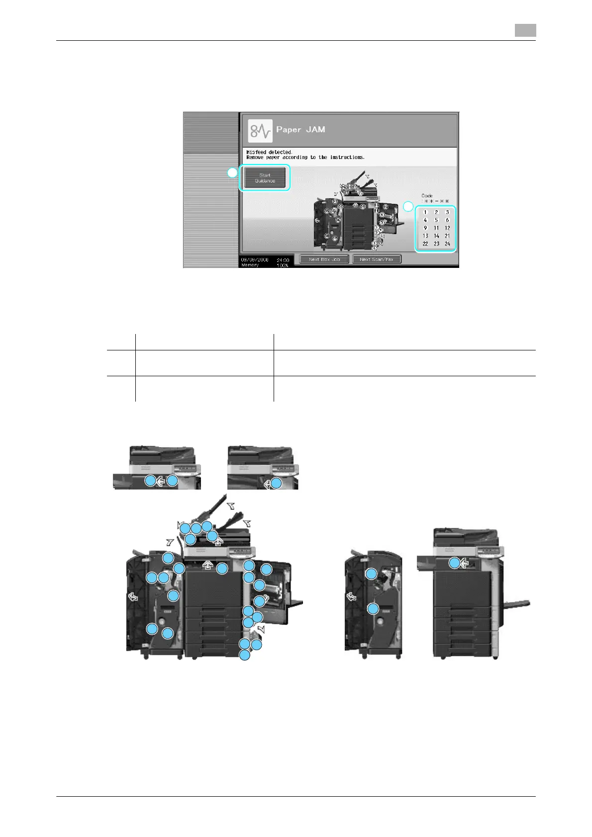 If a paper jam or staple jam occurs, a screen like the one shown below appears with the location of the jam