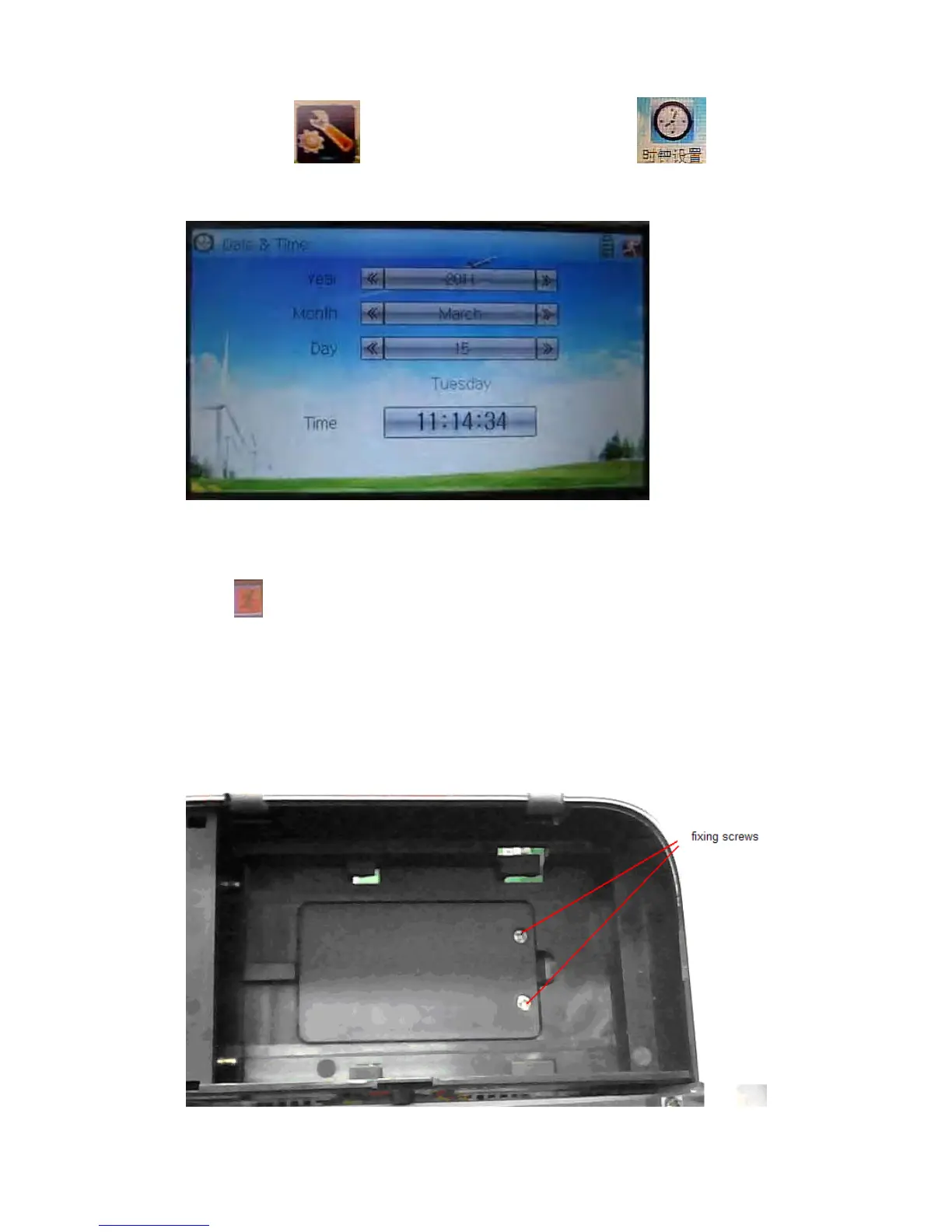 The clock setting is grouped into Year, Month, Day, and Time. Touch the navigation