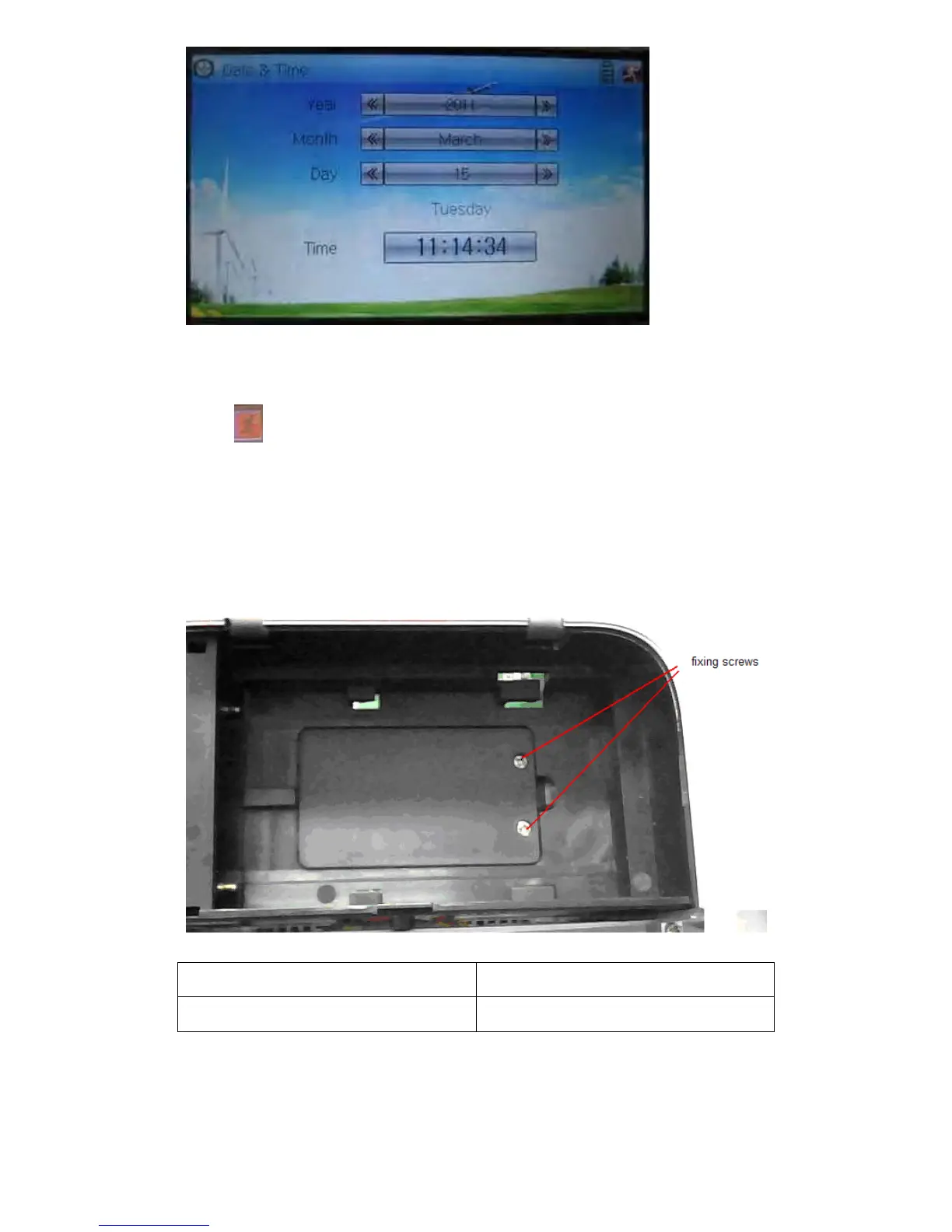 The clock setting is grouped into Year, Month, Day, and Time. Touch the navigation