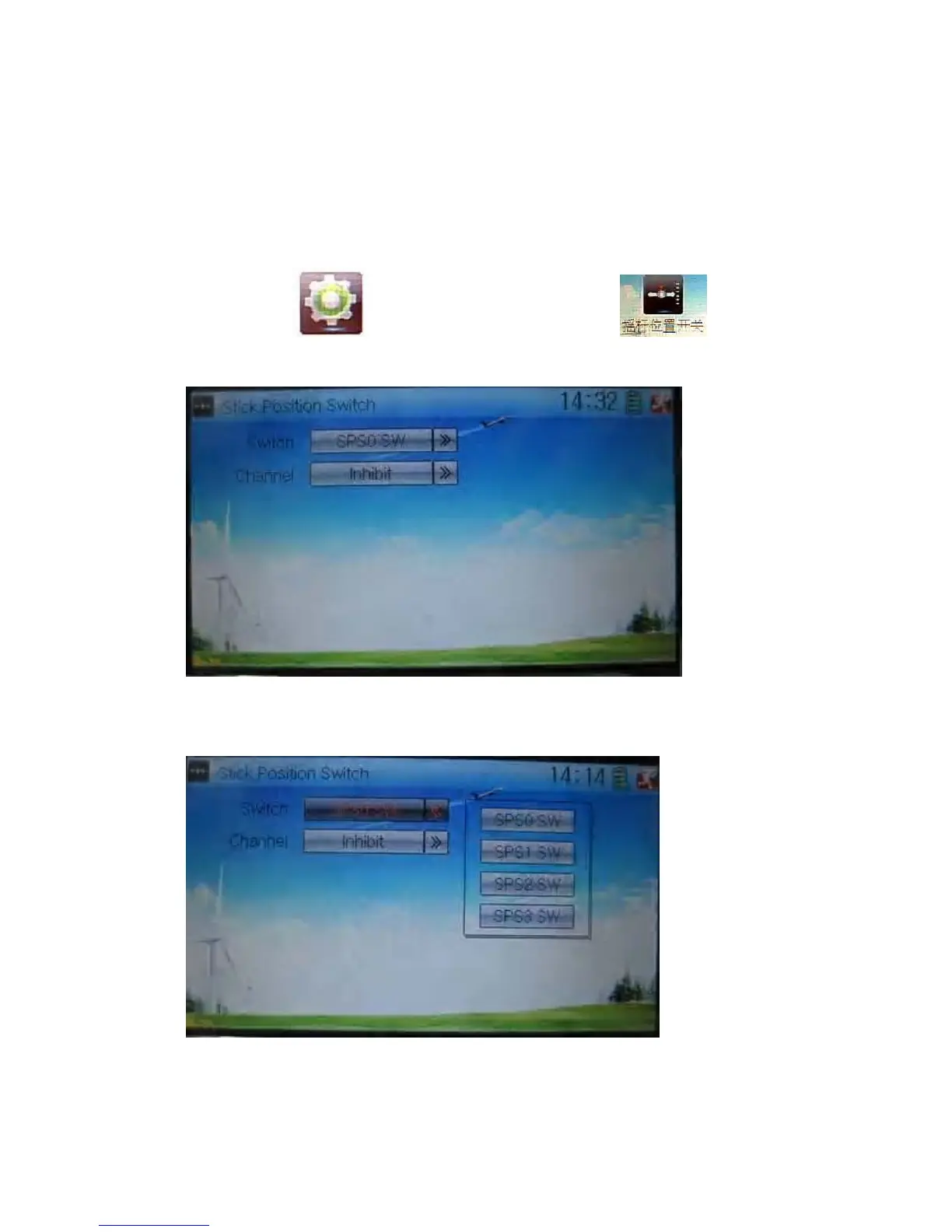 Aileron, Throttle, and Rudder. The factory default setting is Inhibit. Choose the stick