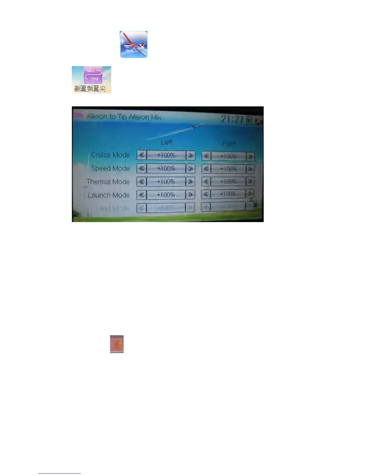 Touch the navigation mark of Left in the flight mode you desire to change the flap mix