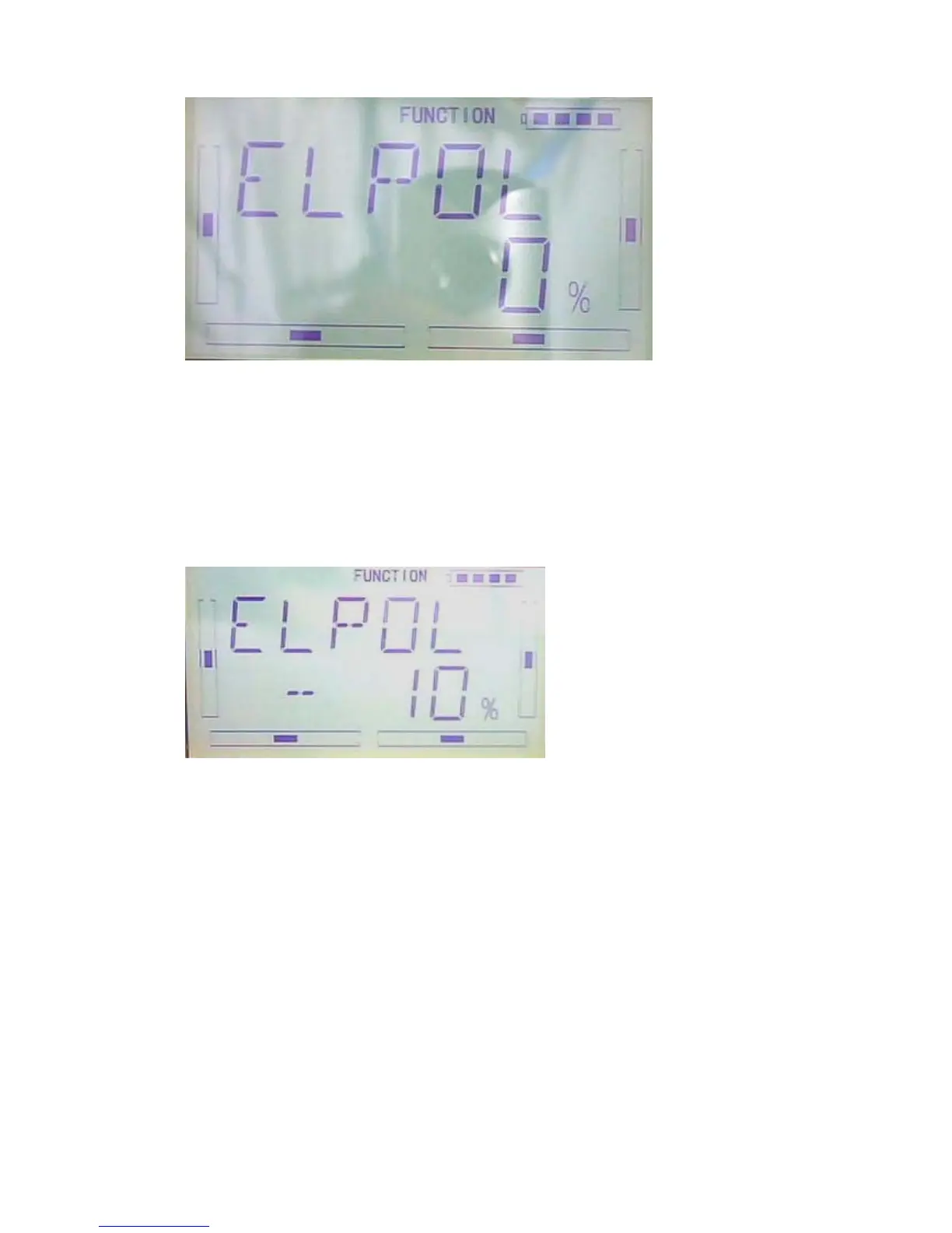1.1) Pos 0 left setting: press R or L button to change the value of elevator mix when