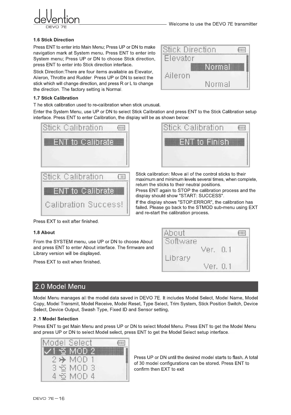 Model Menu manages all the model data saved in DEVO 7E. It includes Model Select, Model Name, Model