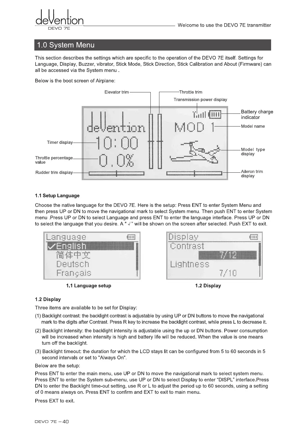 Choose the native language for the DEVO 7E. Here is the setup: Press ENT to enter System Menu and