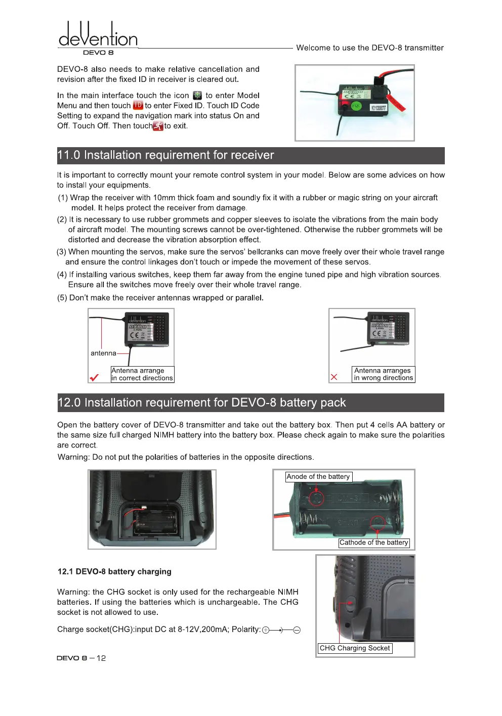 devention DEVO 8 - Installation Requirement for Receiver; Installation Requirement for DEVO-8 Battery Pack