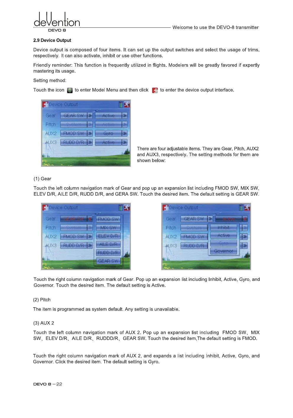 devention DEVO 8 - Device Output; Gear; Pitch; Aux