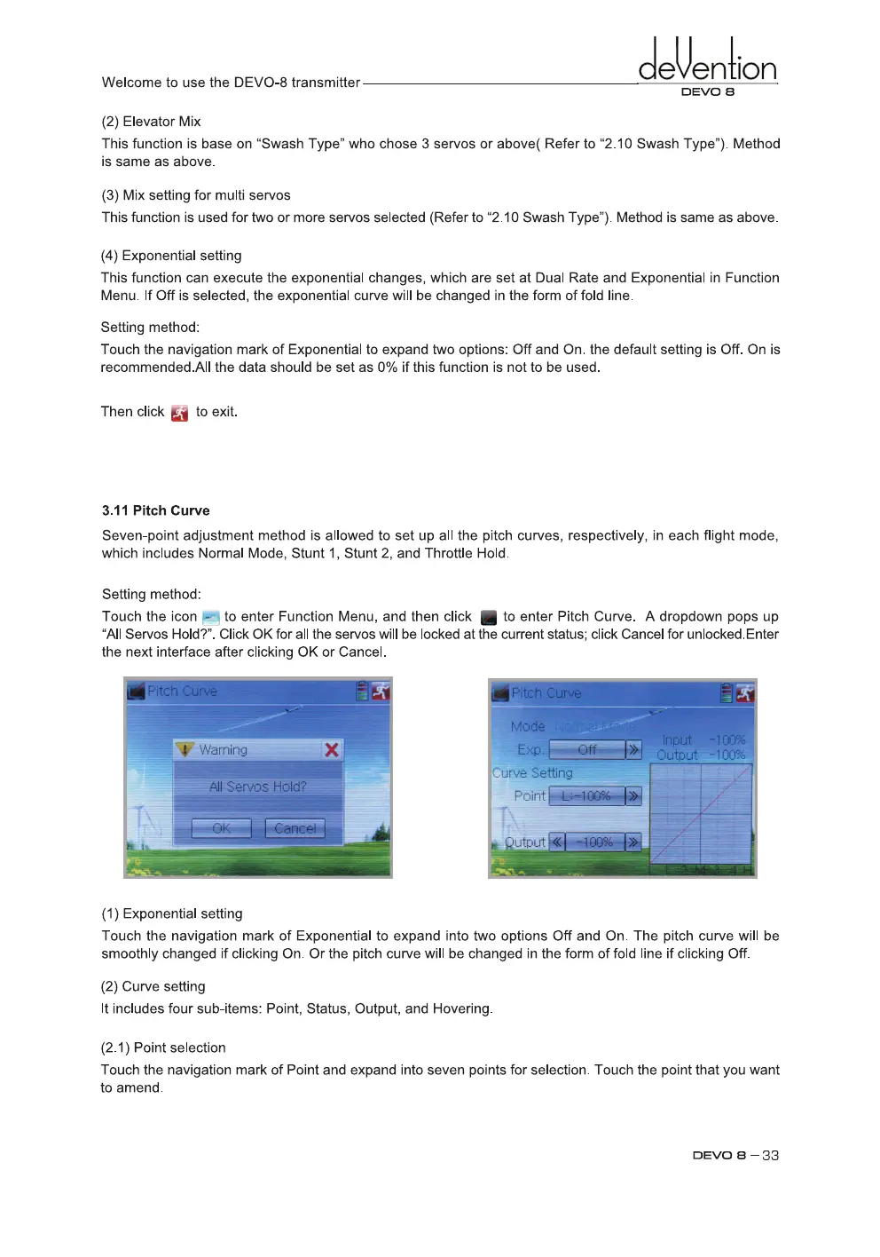 devention DEVO 8 - Pitch Curve; Elevator MIX; MIX Setting for Multi Servos; Exponential Setting