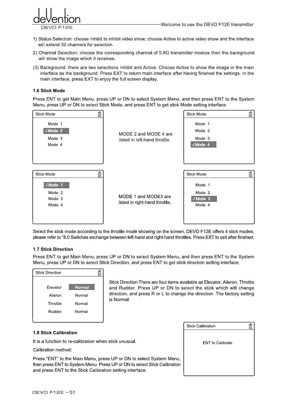 Select the stick mode according to the throttle mode showing on the screen. DEVO F12E offers 4 stick modes,