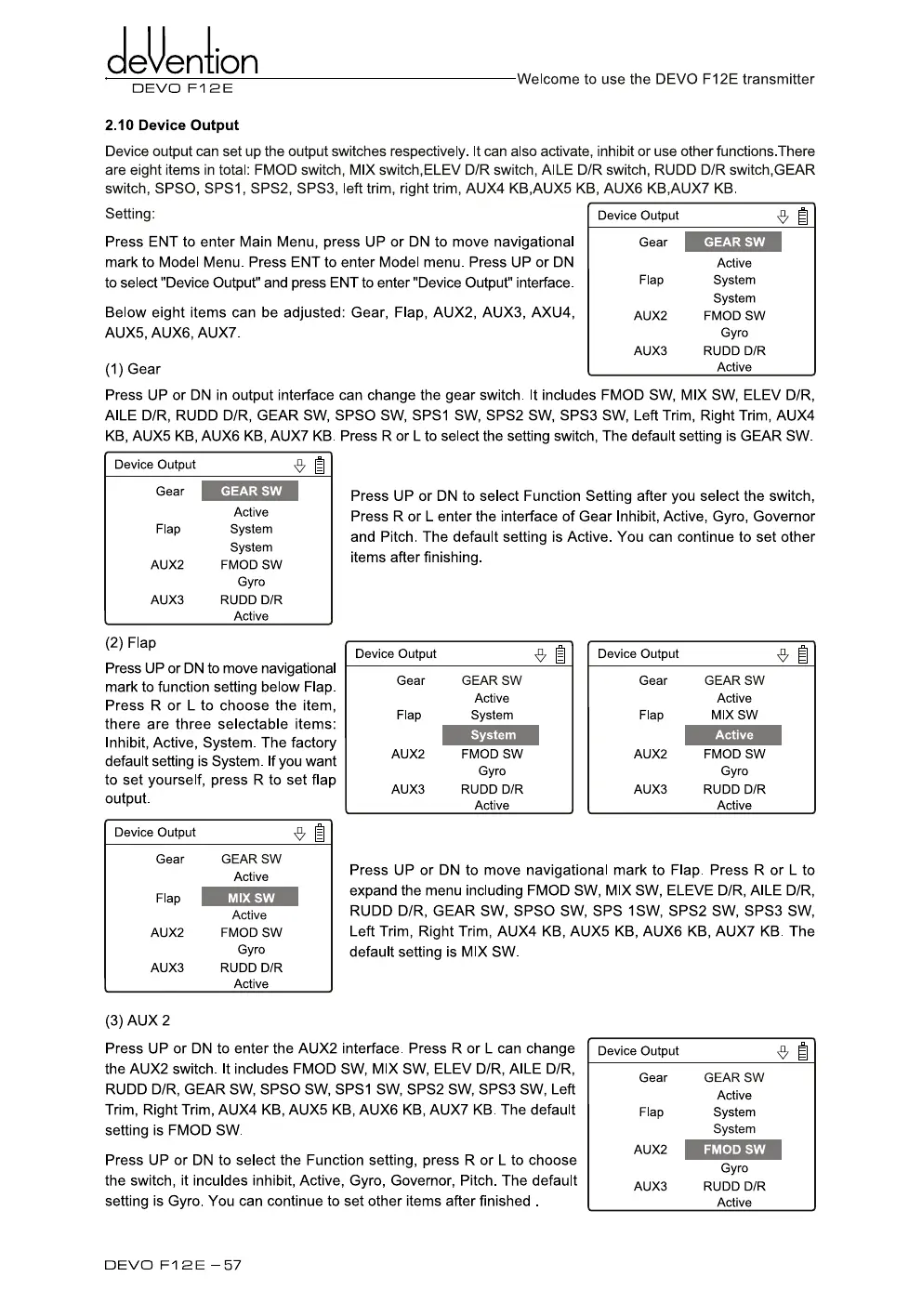 Press UP or DN in output interface can change the gear switch. It includes FMOD SW, MIX SW, ELEV D/R,