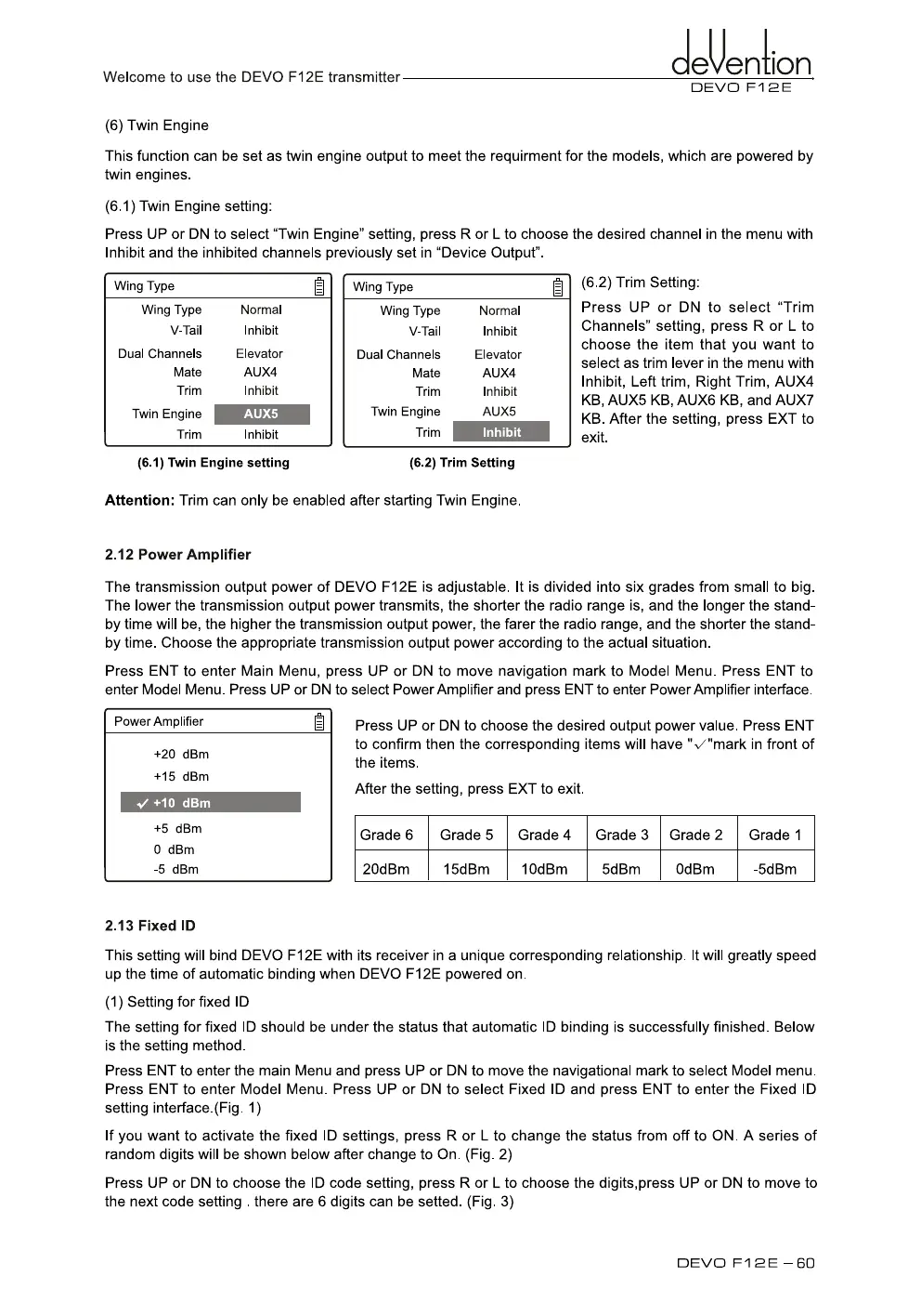 The transmission output power of DEVO F12E is adjustable. It is divided into six grades from small to big.